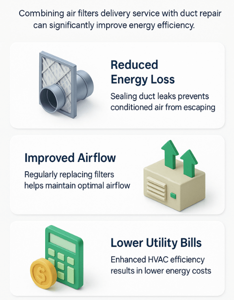 Yes. A clean, high-quality filter allows your HVAC system to move air freely, preventing it from overworking. Studies show that regularly changing filters can cut energy use by 5–15%. When combined with duct repair, the efficiency gains are even greater.